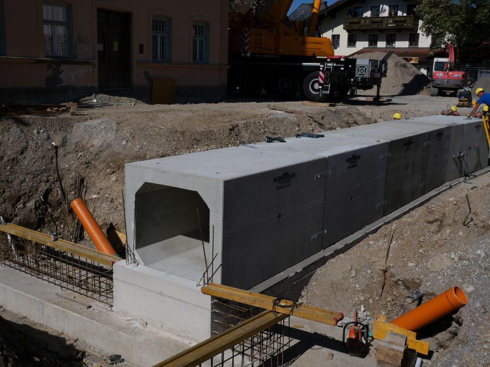 Das bisherige Rundrohr mit einem Durchmesser von einem Meter wurde durch ein neues Rechteckrohr mit den Innenmaßen 1,2 x 1,3 Meter ersetzt. Diese Anpassung war erforderlich, um den gestiegenen Anforderungen an den Hochwasserschutz gerecht zu werden. Laut dem zuständigen Wasserwirtschaftsamt und der Wasserrechtsabteilung des Landratsamtes (LRA) war es eine Auflage, dass durch die Bauarbeiten der Hochwasserschutz des gesamten Baches nicht beeinträchtigt werden darf. Dies führte letztendlich zur Entscheidung für das größere Rechteckrohr.